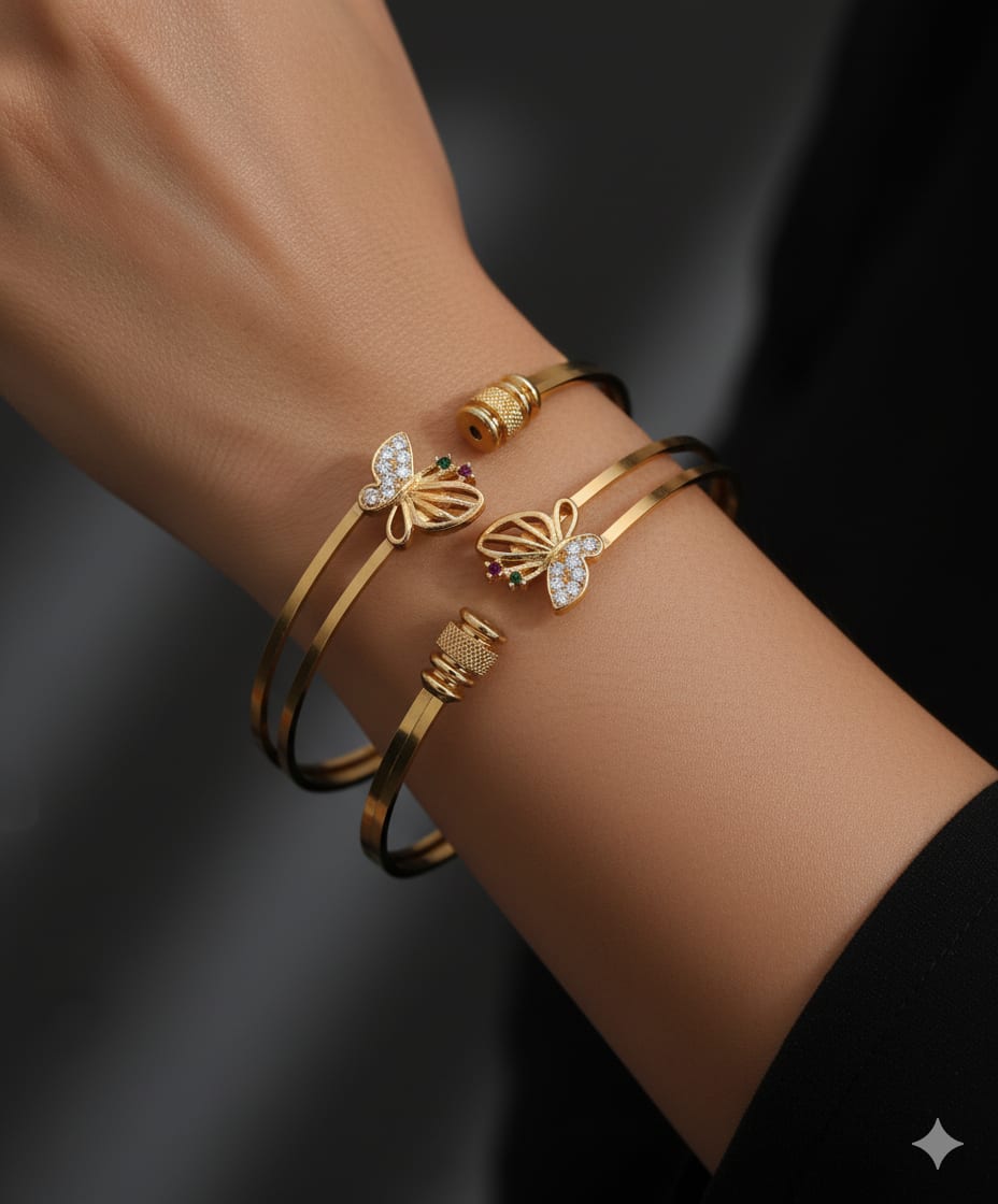 Bring elegance and charm to your ethnic look with this beautiful pair of designer bangles featuring butterfly motifs studded with sparkling American diamonds. These high gold plated bangles are artistically designed with a modern twist, featuring fine detailing, shimmering AD stones, and colorful accents in red and green to highlight the butterfly wings.