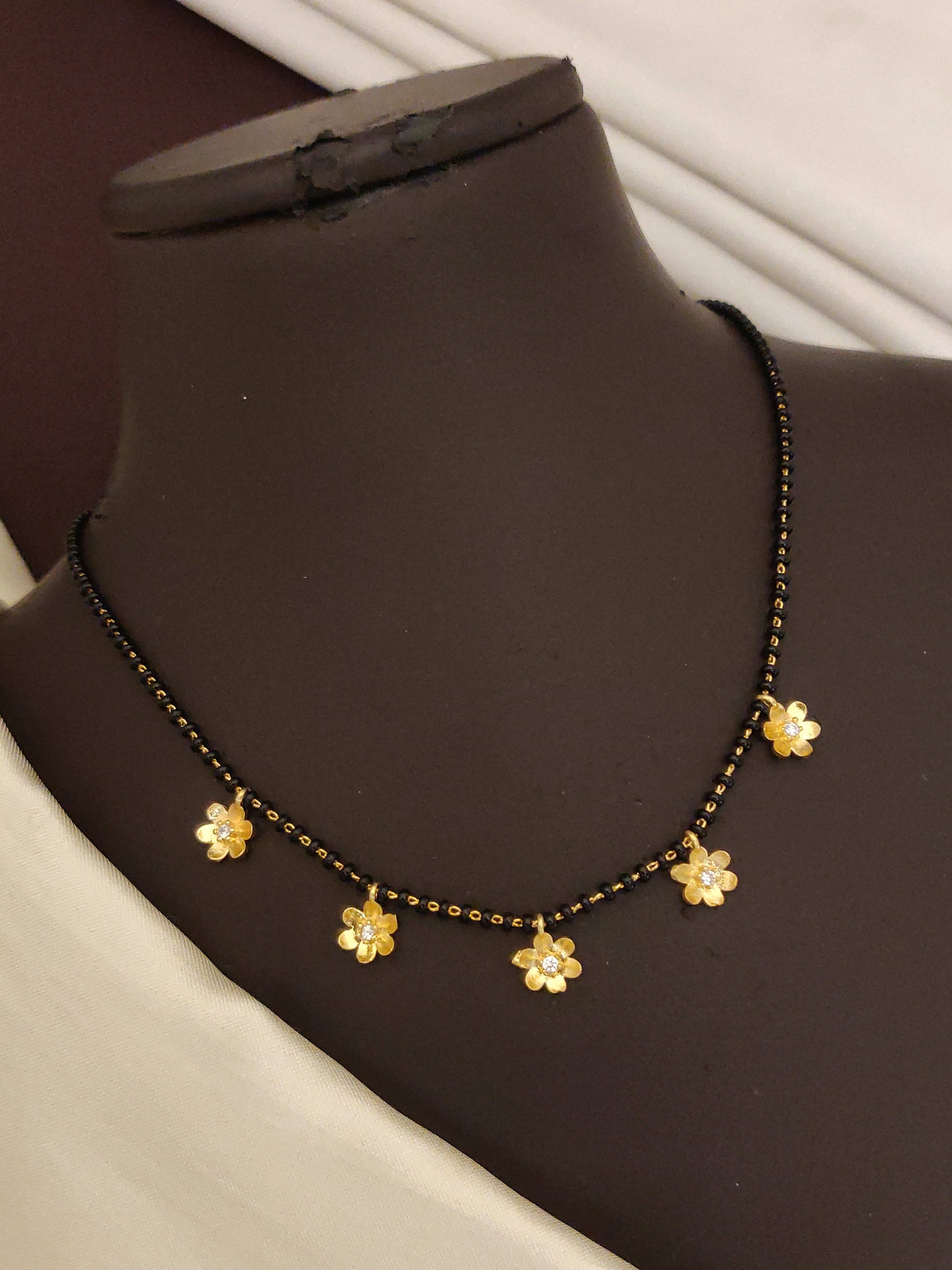 This elegant mangalsutra is crafted with premium gold plating and features a beautiful floral pendant studded with sparkling AD diamonds for a graceful appeal. Lightweight and durable, it is perfect for daily wear, festive occasions, and cultural celebrations. Its timeless floral design complements both ethnic and modern outfits, making it a versatile jewelry piece for married women and an ideal gift for weddings, anniversaries, and special occasions.