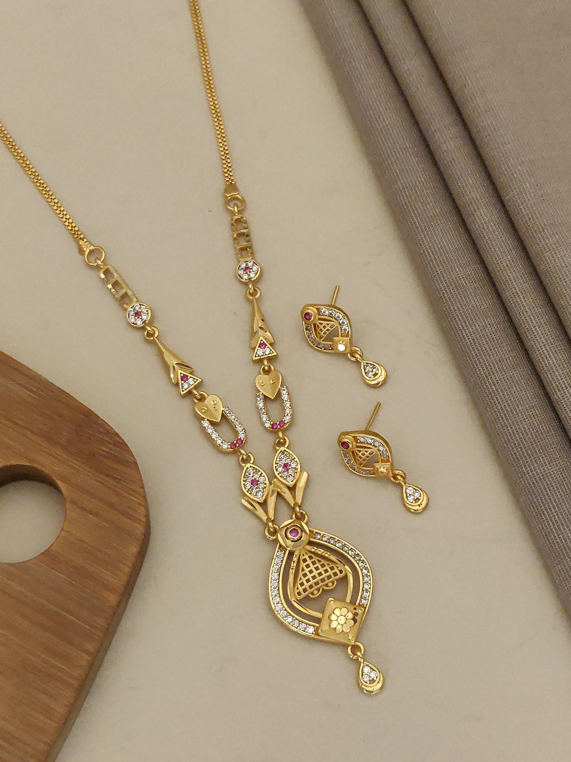 This elegant necklace set features a fancy forming design studded with sparkling AD diamonds and finished with premium micro gold plating. Complete with matching earrings, it is lightweight, durable, and perfect for weddings, festive occasions, parties, and daily wear. A versatile jewelry set, it adds timeless charm and sophistication to both ethnic and western outfits.