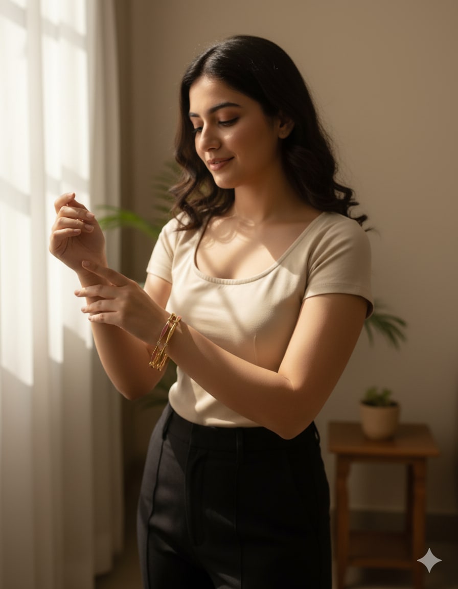 “Colour and shine of bangles is very pretty. In local shops we don’t get such modern design. Happy with purchase.”