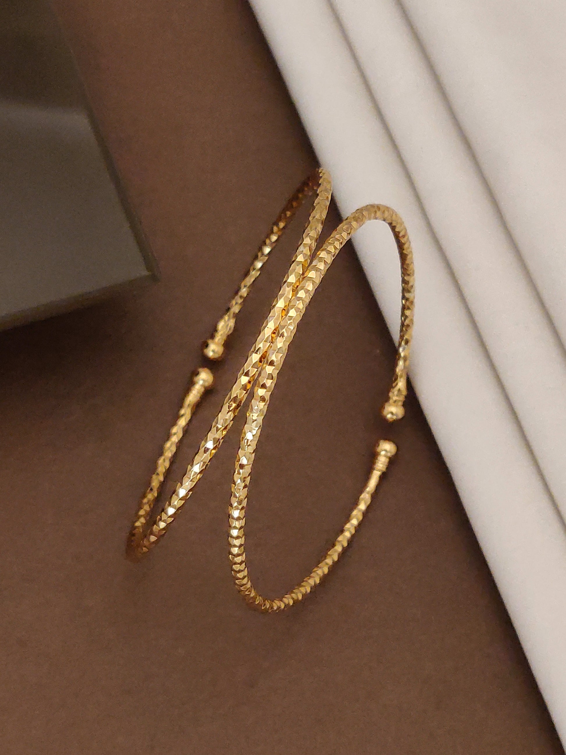 Add a touch of sophistication to your traditional look with this exquisite set of high gold plated textured designer bangles. Crafted with precision, these bangles feature intricate detailing that exudes elegance and charm. The premium gold plating ensures lasting shine, while the adjustable design offers a comfortable and secure fit for any wrist size. Perfect for weddings, festive occasions, or daily wear, these bangles beautifully complement both ethnic and contemporary outfits. Elevate your jewelry collection with this timeless pair that radiates grace and style.