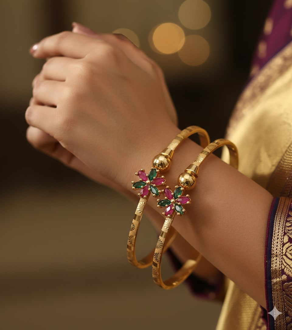 This elegant kadli set features beautiful flower designs with sparkling AD diamonds and traditional kempu work. The micro gold plating gives a rich, real gold shine that lasts long. Adjustable and comfortable for any wrist size, perfect for festive and wedding wear. Lightweight yet classy, it adds a royal charm to your look!
