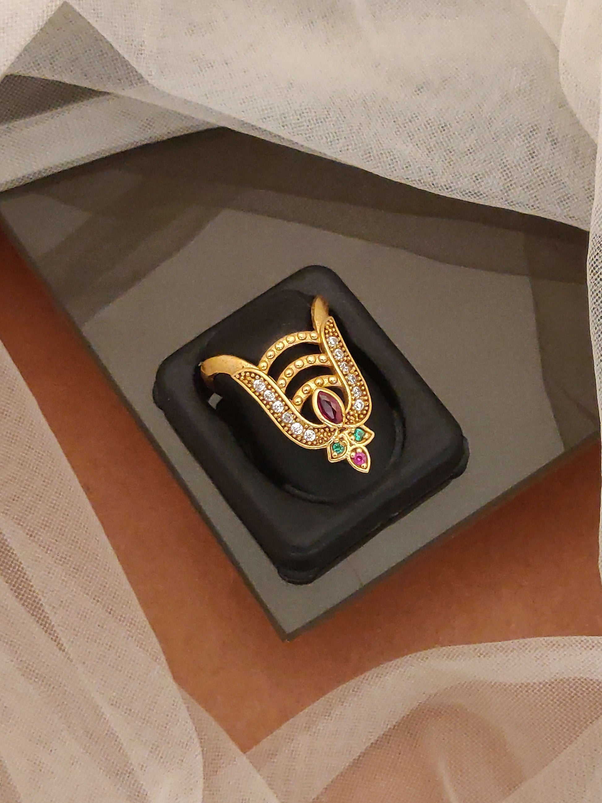 This micro gold plated AD diamond studded adjustable leaf ring is a graceful blend of elegance and modern style. The delicate leaf design, enhanced with sparkling AD diamonds, adds a touch of sophistication to any look. Its micro gold plating ensures lasting shine and durability, making it perfect for daily wear. With an adjustable fit, it offers comfort and flexibility for all finger sizes. A stylish and versatile accessory that complements both casual and festive outfits with ease.