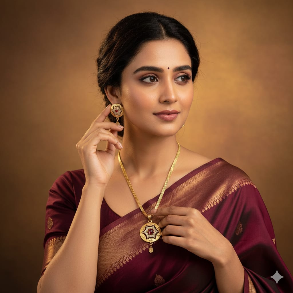 This beautiful pendant set features a sparkling star design studded with AD diamonds and comes with a matching chain. The micro gold plating gives it a rich, long-lasting shine. Perfect for parties, weddings, and festive occasions, adding elegance to any outfit. Lightweight and stylish, ideal for enhancing your traditional or modern look!